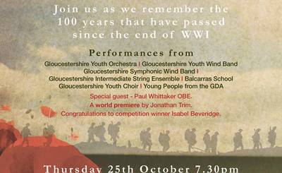 On Thursday 25th October, Gloucestershire Music (Local Authority Music Service) and the Cheltenham Trust will be joining forces to commemorate 100 years since the end of WWI. This short concert will include performances by the Gloucestershire Youth Choir, Gloucestershire Youth Orchestra, Gloucestershire Intermediate String Ensemble, Balcarras School, Gloucestershire Deaf Association, Paul Whittaker and the combined bands of the Gloucestershire Symphonic Wind Orchestra and the Gloucestershire Youth Wind Orchestra.
